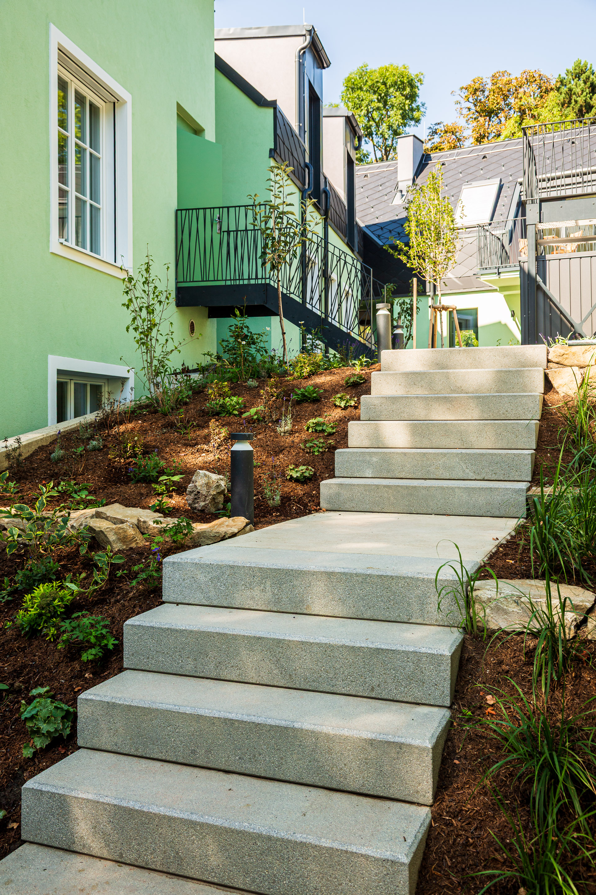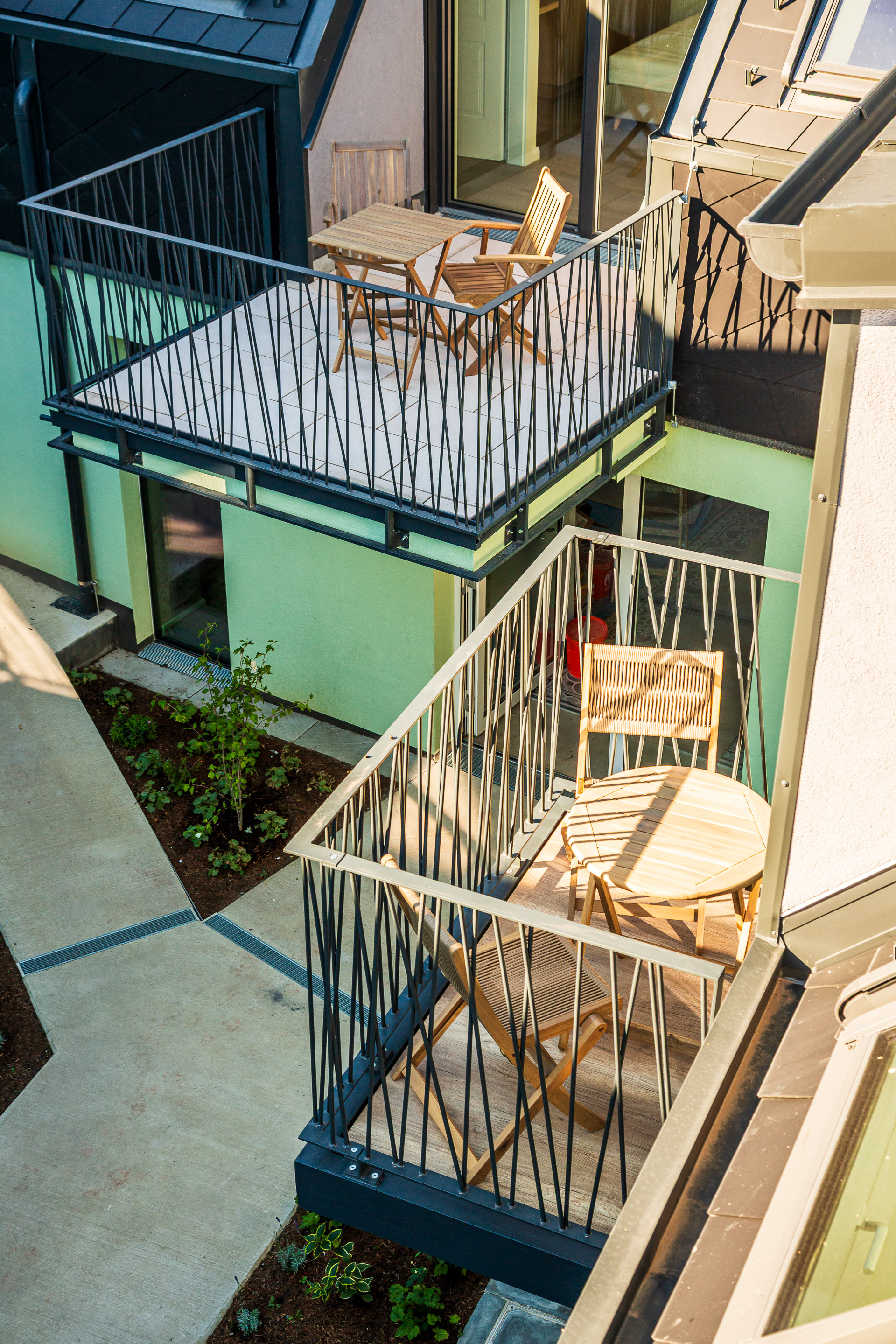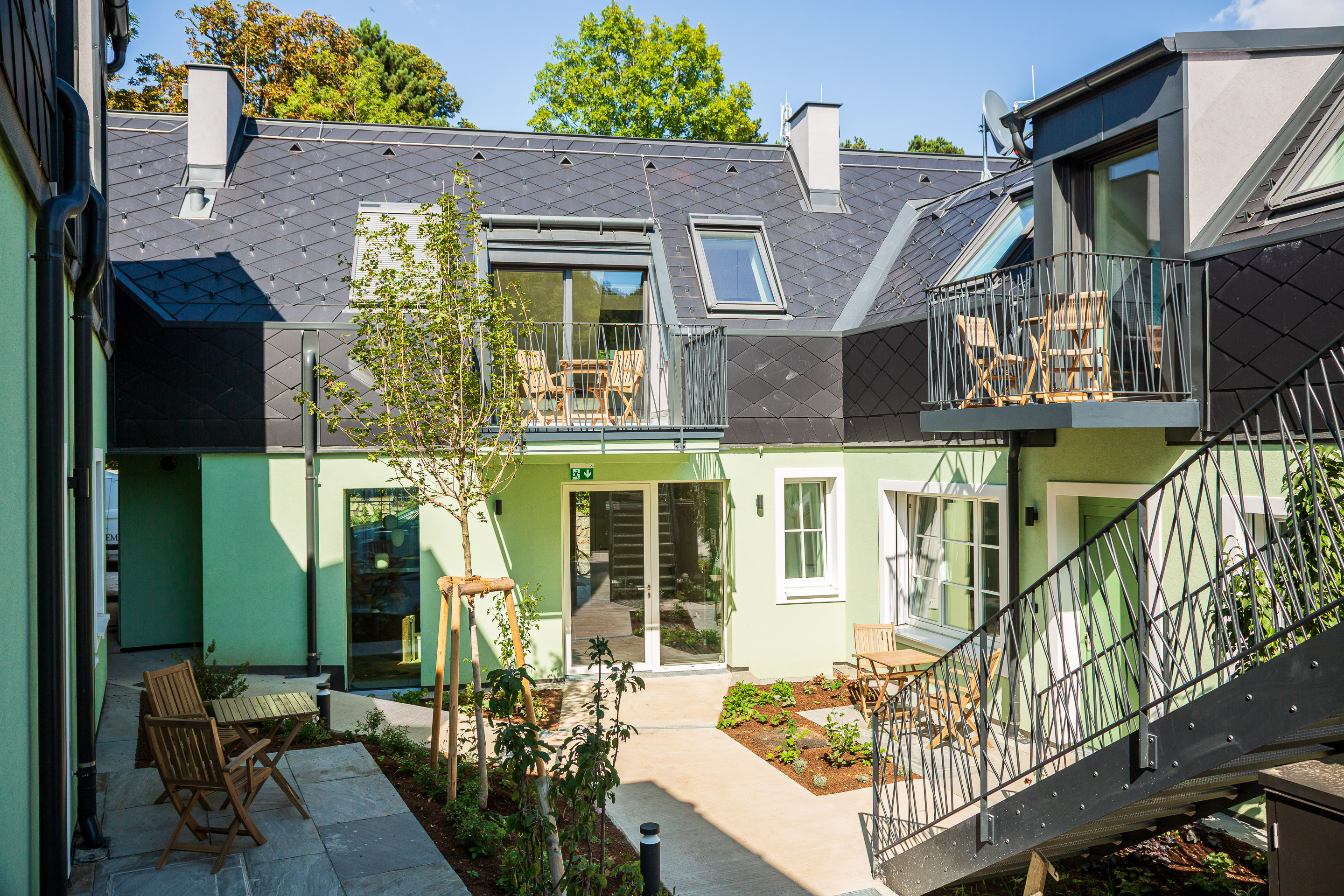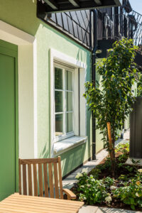 Genießen Sie die Blicke aus den Suiten in den Innenhof und Garten. Wir ersuchen nicht in die Grünflächen zu steigen. Die Wiesenfläche neben der Terrasse auf der unteren Ebene kann gerne frei genutzt werden. Ebenso die Terrasse solange keine Veranstaltungen geplant sind.
