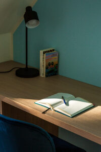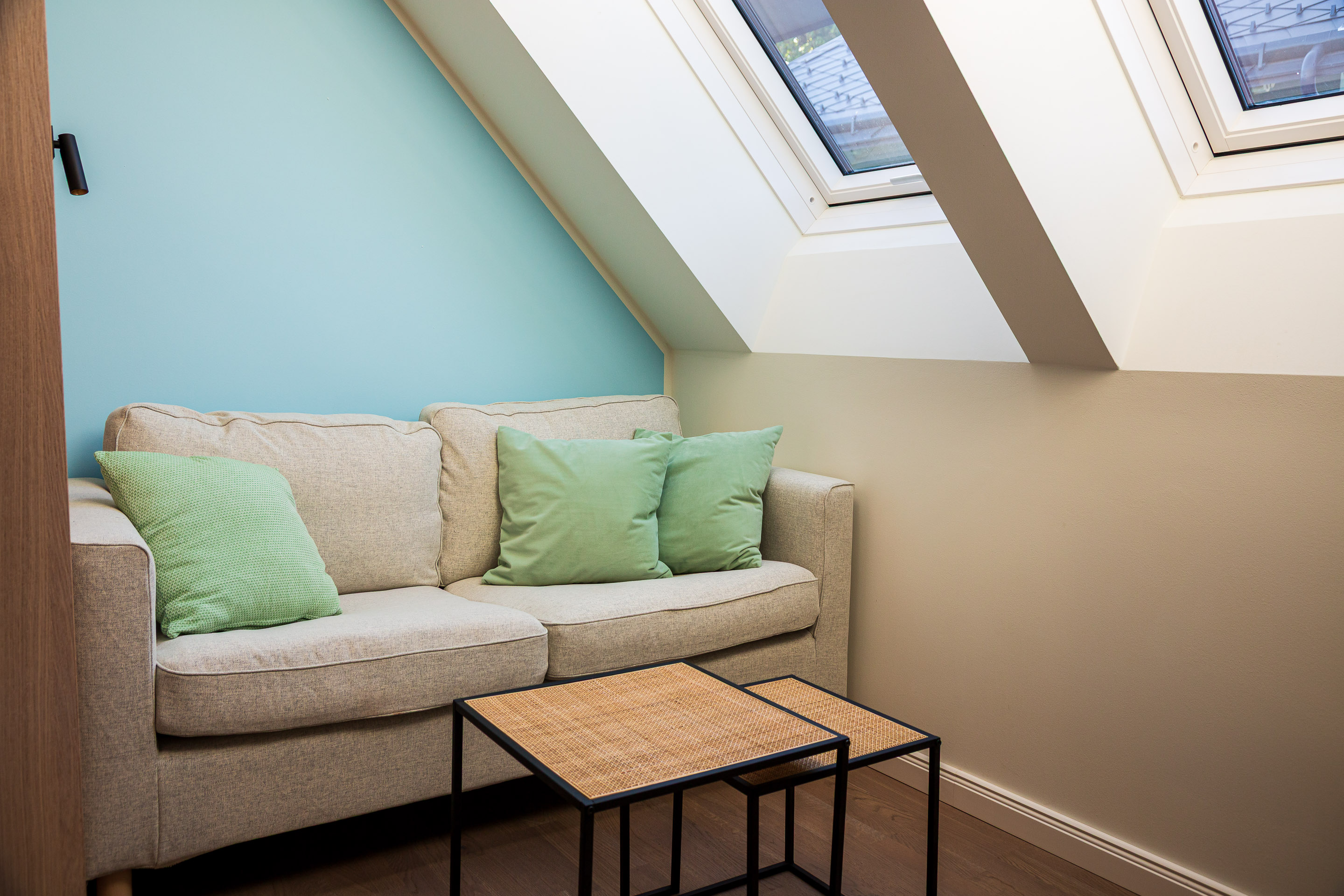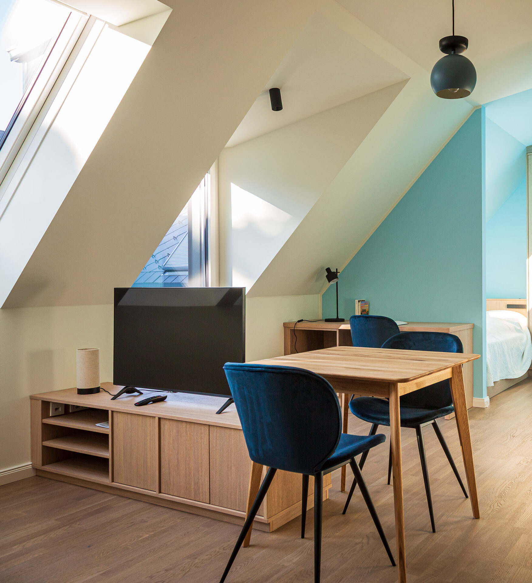 Azure blue, light-filled, sky-high — it sounds like a holiday, but it’s the everyday living experience of this rooftop oasis. Generous windows open the view to the sky. The high ceilings free the mind and enhances a sense of well-being. The refined design of the open-plan living area brings together a sofa lounge, the dining table, a workspace, the kitchen and balcony access. And there’s plenty of room for rest as well: the sleeping area is stylishly separated, while the centrally accessible bathroom ensures maximum privacy.