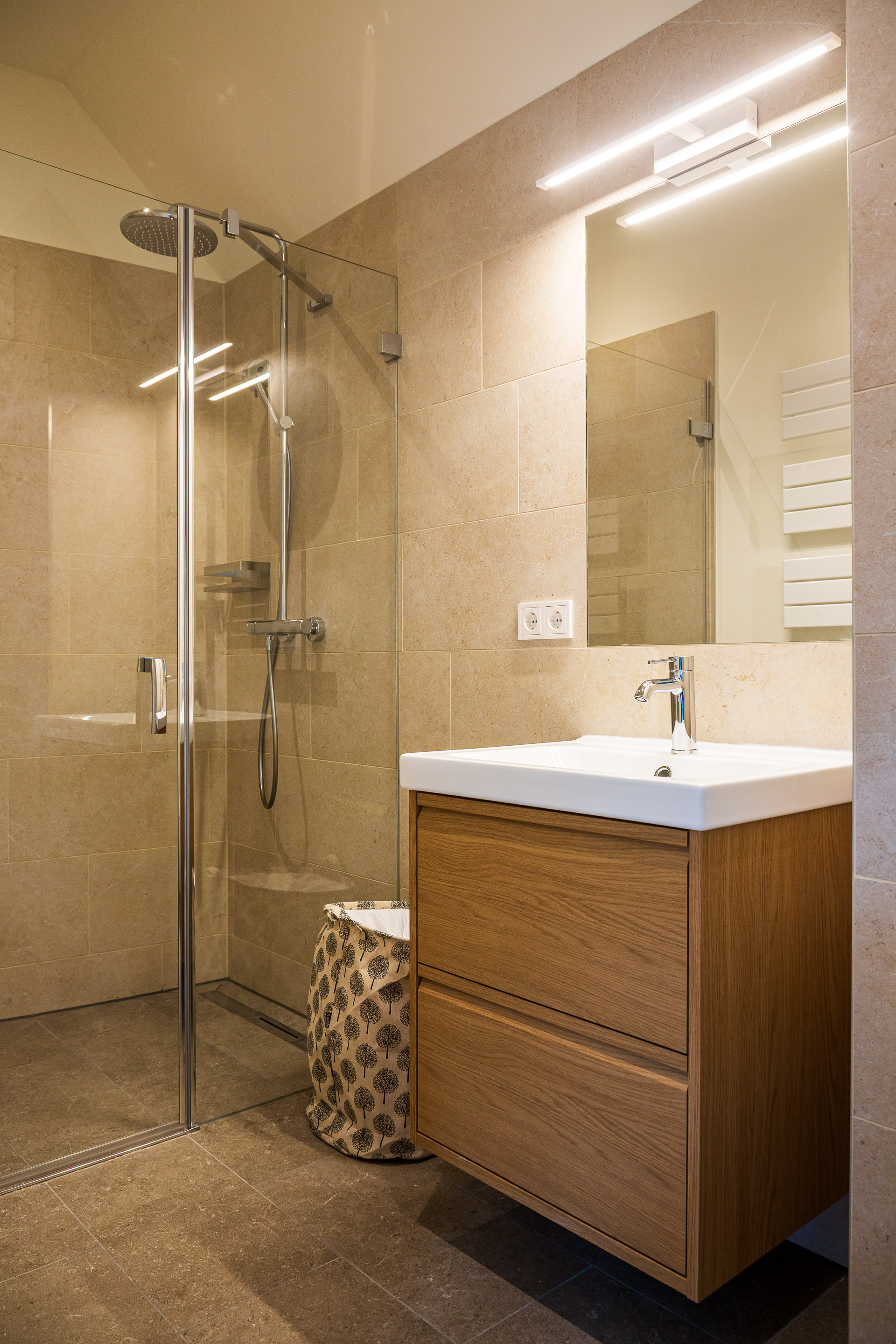 bathroom essentialsrain shower, heated towel rail, towels, bath mat, hairdryer